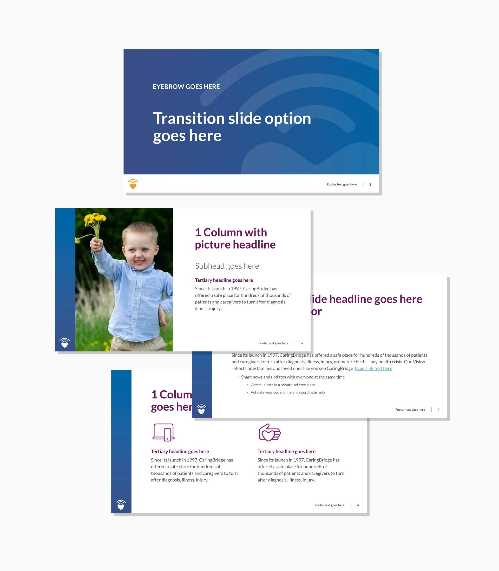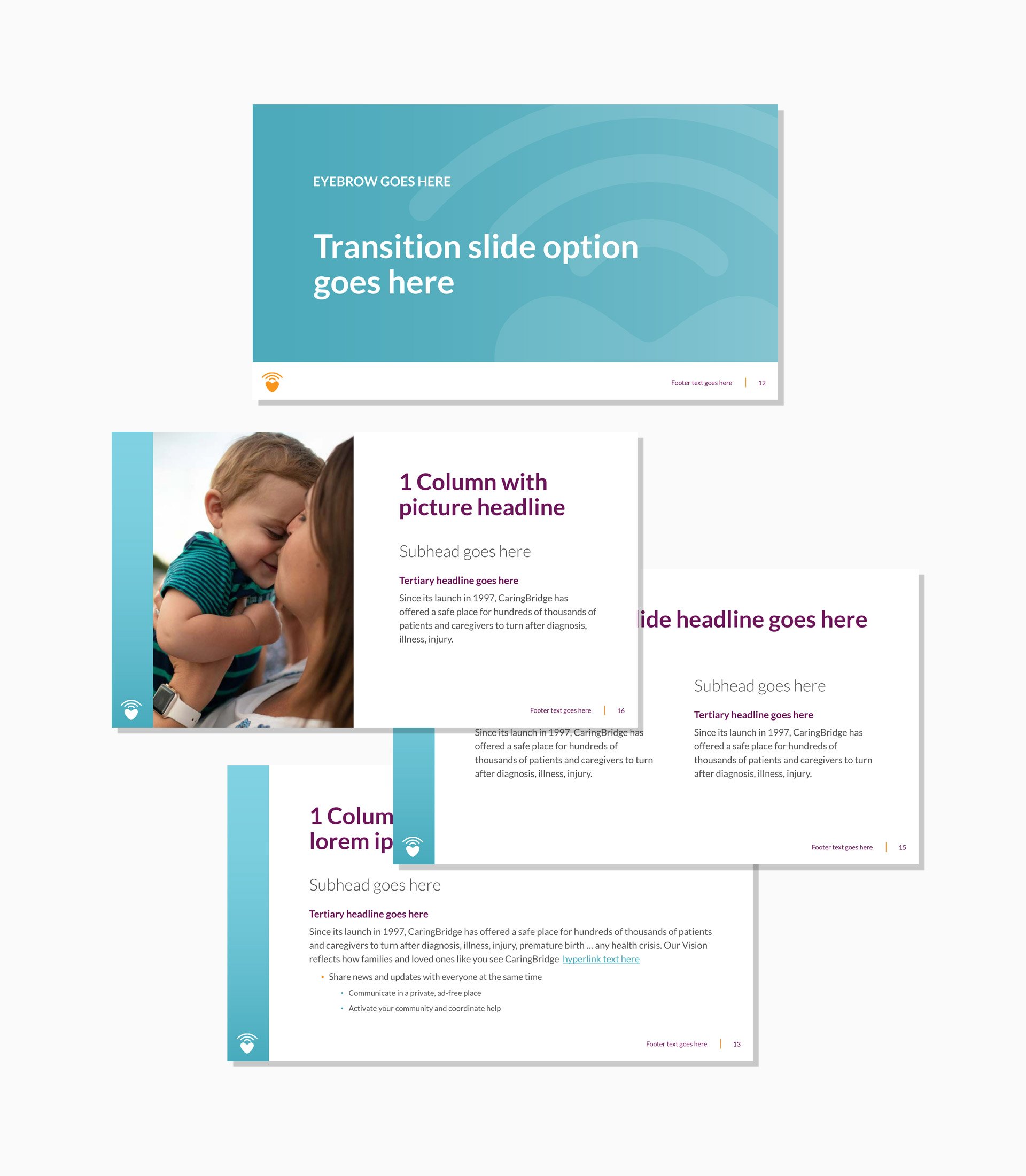 My work for the Caring Bridge team involved designing a versatile presentation deck useful to their staff. Several layouts and color combinations were created within their brand standards. Careful attention was paid to the hierarchy and layout of text and images.