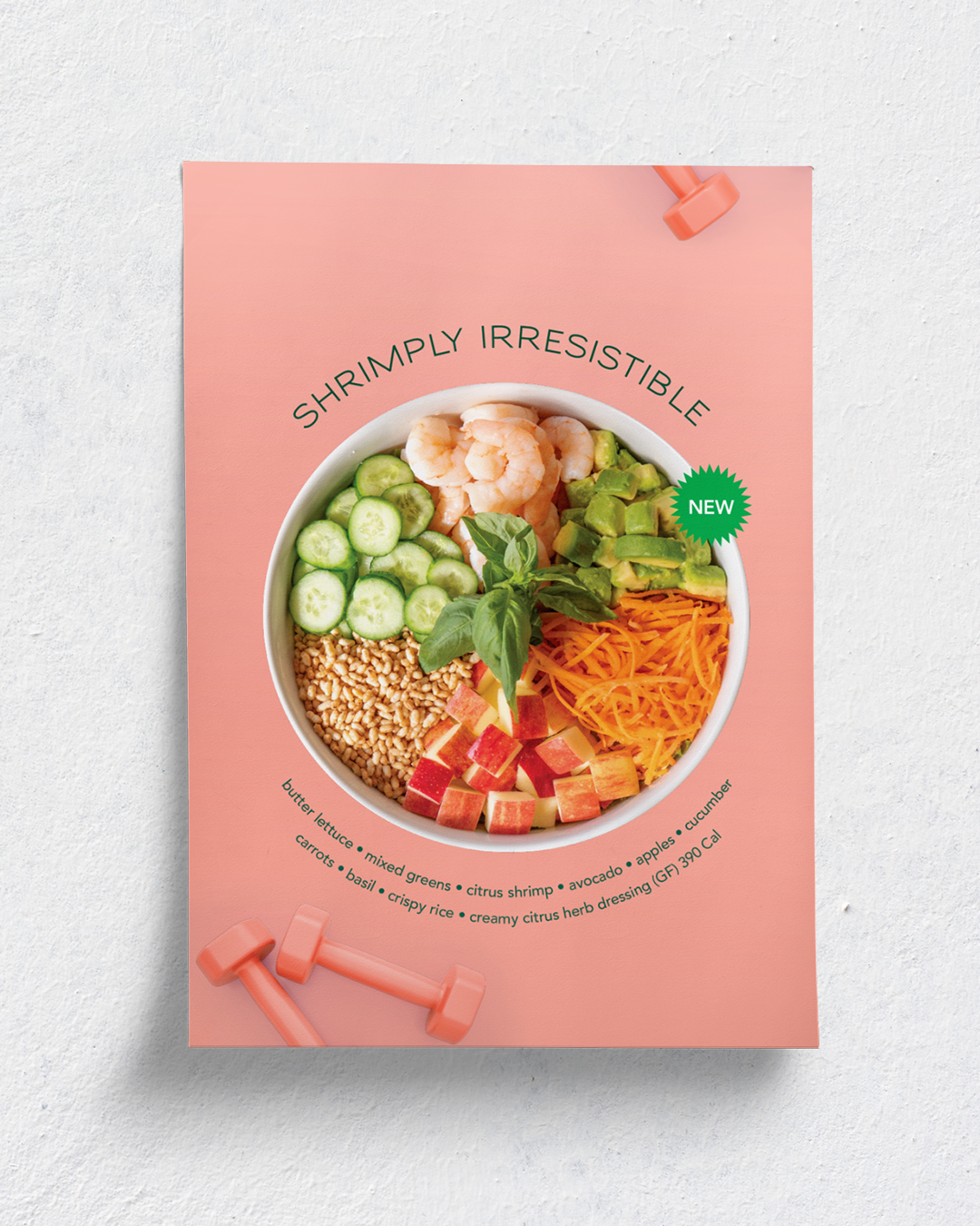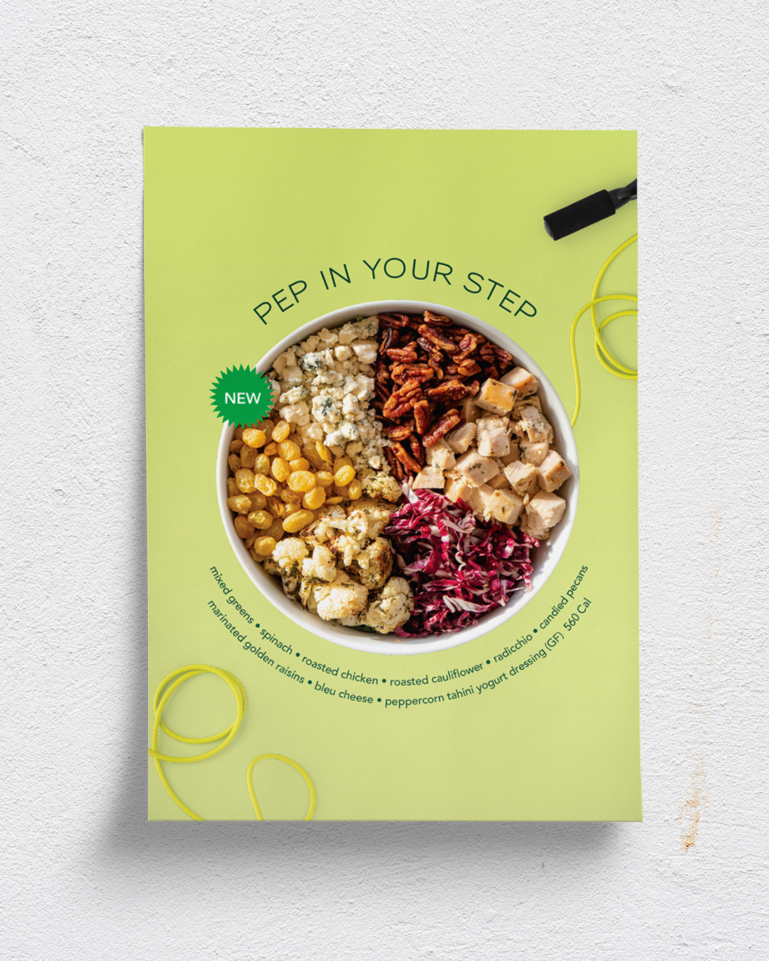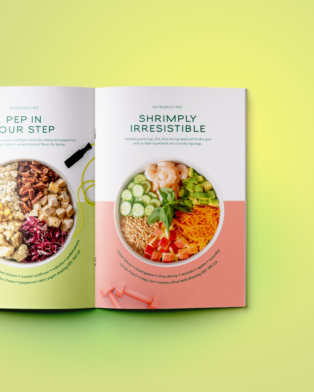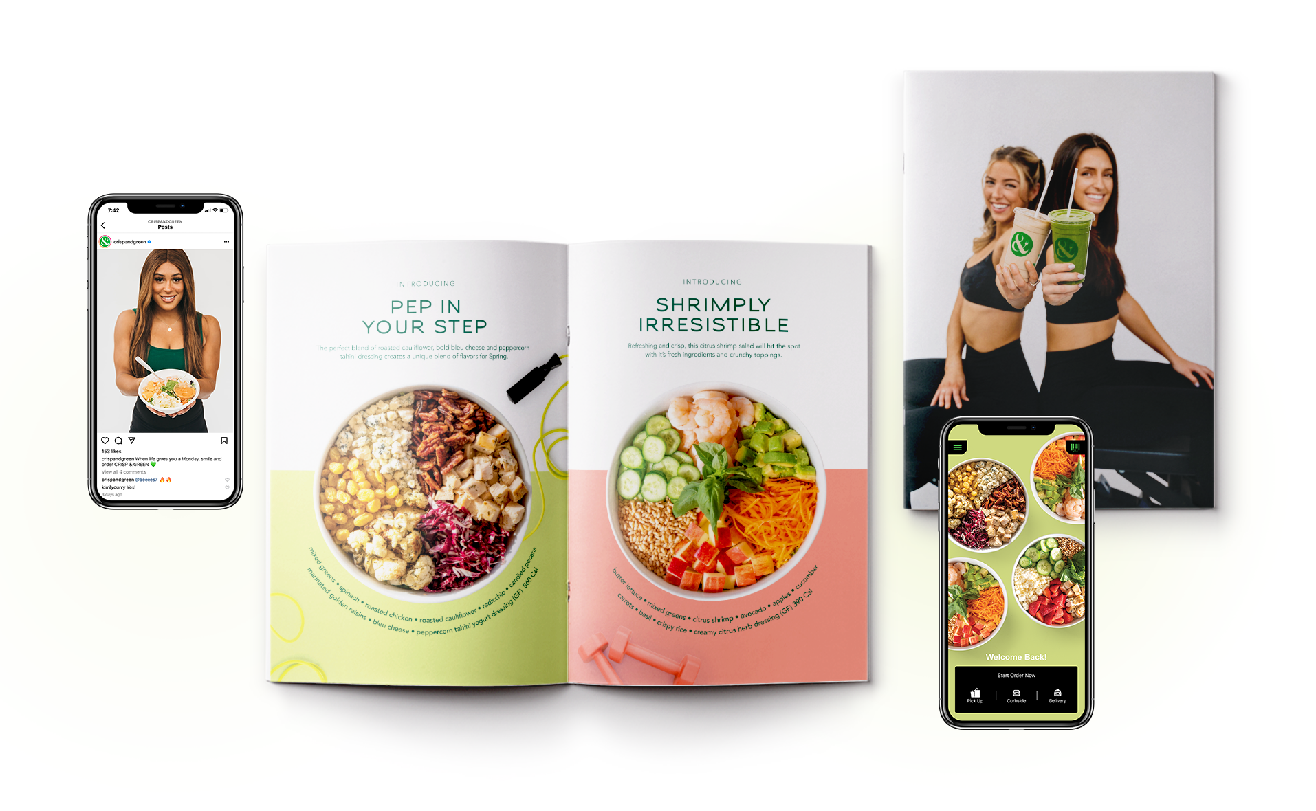 To promote their new spring salads and on-site fitness classes, I helped Crisp & Green launch a seasonal campaign that tied healthy food to fitness. I presented them with three visual directions. The chosen one was further explored and implemented to create menus, promotional collateral, app graphics and social posts.