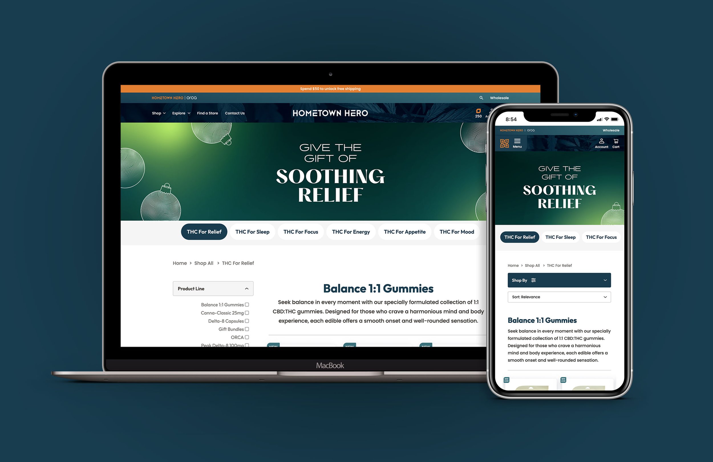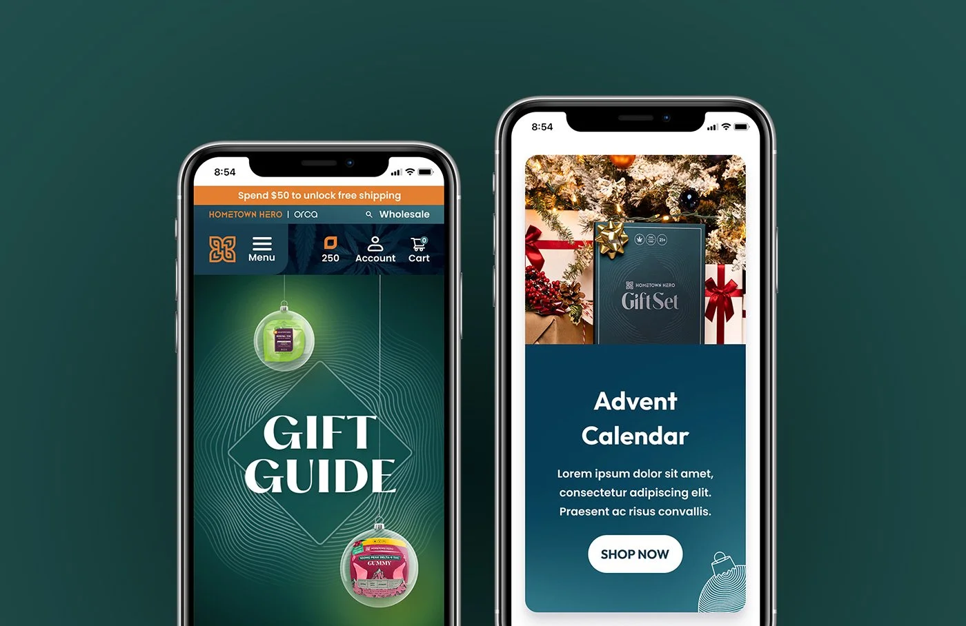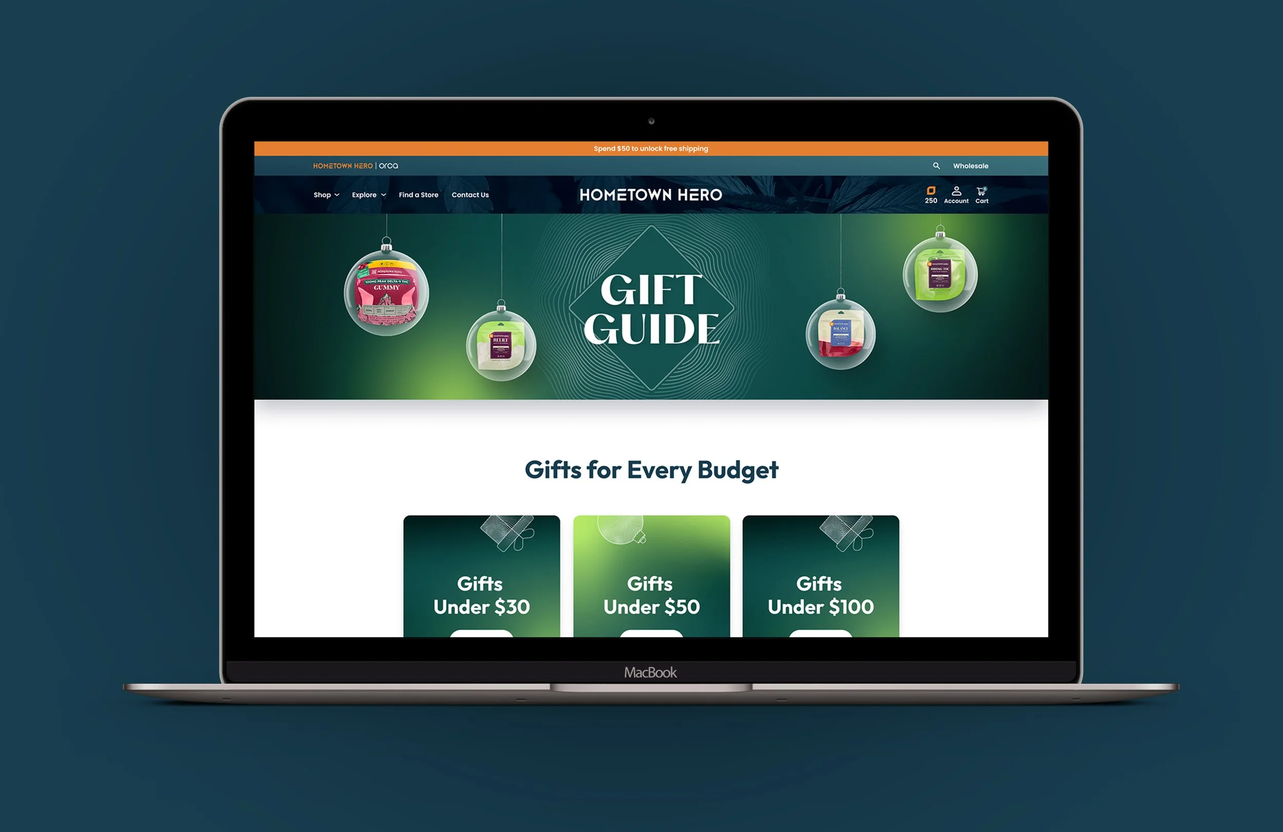 I worked with the Hometown Hero marketing team to develop a campaign design system using their existing brand elements in novel ways to evoke a festive spirit. I worked with their brand manager and web developer to design and structure the landing page in an engaging and functional way for mobile and desktop. The creative concepts created for this page set the tone for social posts, digital ads and promotions within their email newsletter.